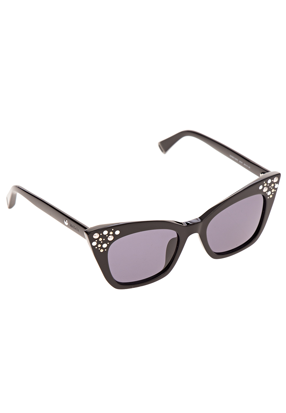Детали: форма «кошачьи глаза», пластиковая оправа с декором кристаллами, линзы с фактором защиты 2’’ – повседневный, пластиковые дужки.