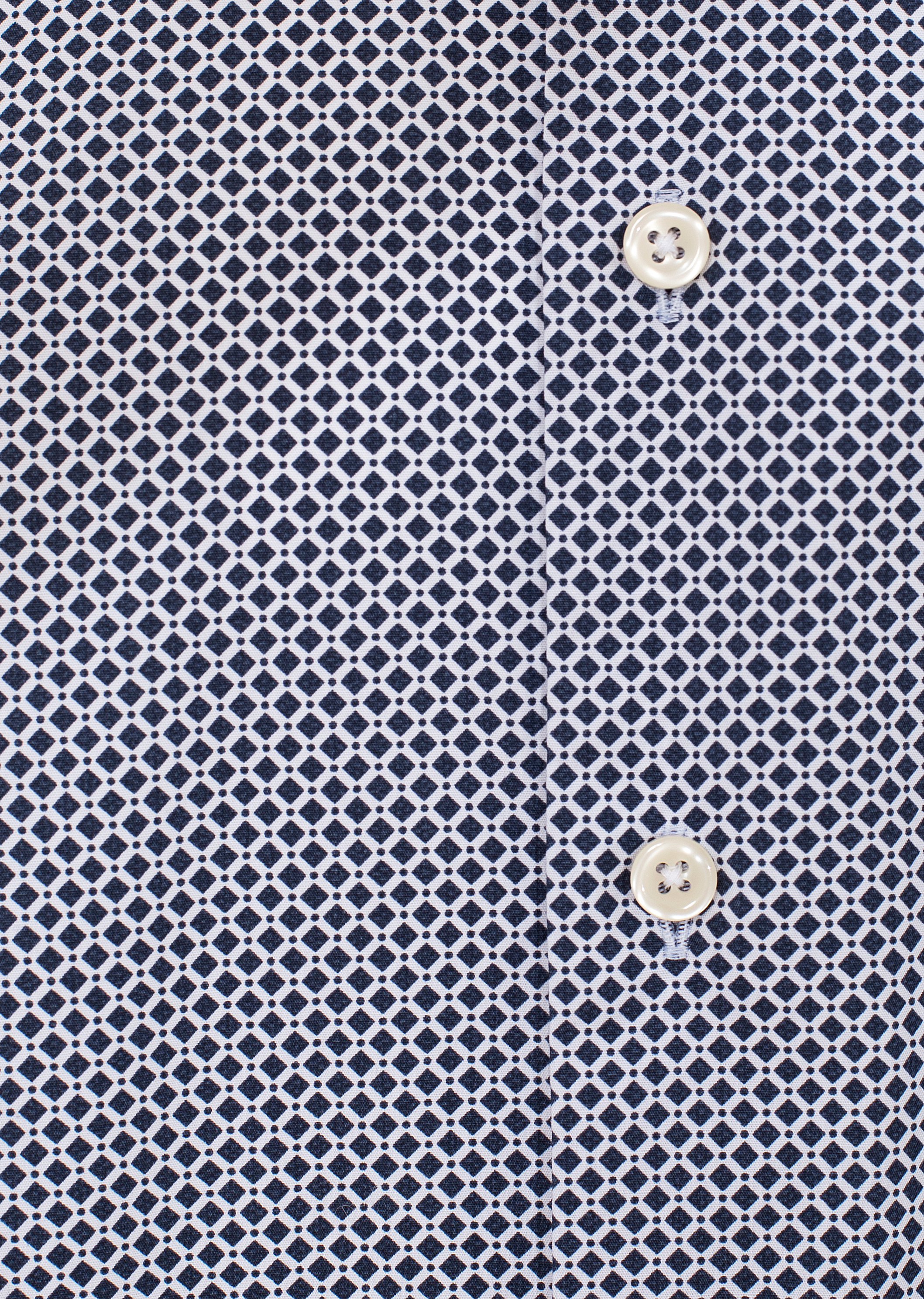 Детали: прямой крой с выточками на спинке, отложной воротник, длинный рукав с манжетом под пуговицу или запонку. Застегивается рядом пуговиц. Двуцветный принт в мелкий ромб.