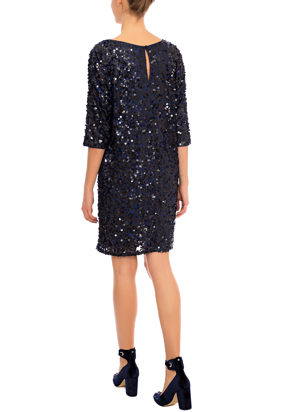 Детали: прямой крой, круглый вырез декольте с каплей на спинке, втачной рукав длиной ¾, длина выше колена. Матовые чёрные пайетки на цветном фоне.