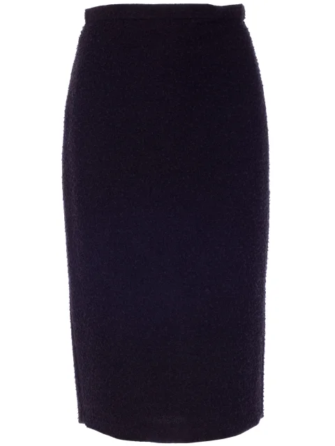 Детали: облегающий силуэт, высокая посадка, длина ниже колена, ворсистая неравномерная фактура ткани. Сзади небольшая шлица, застёгивается потайной молнией.