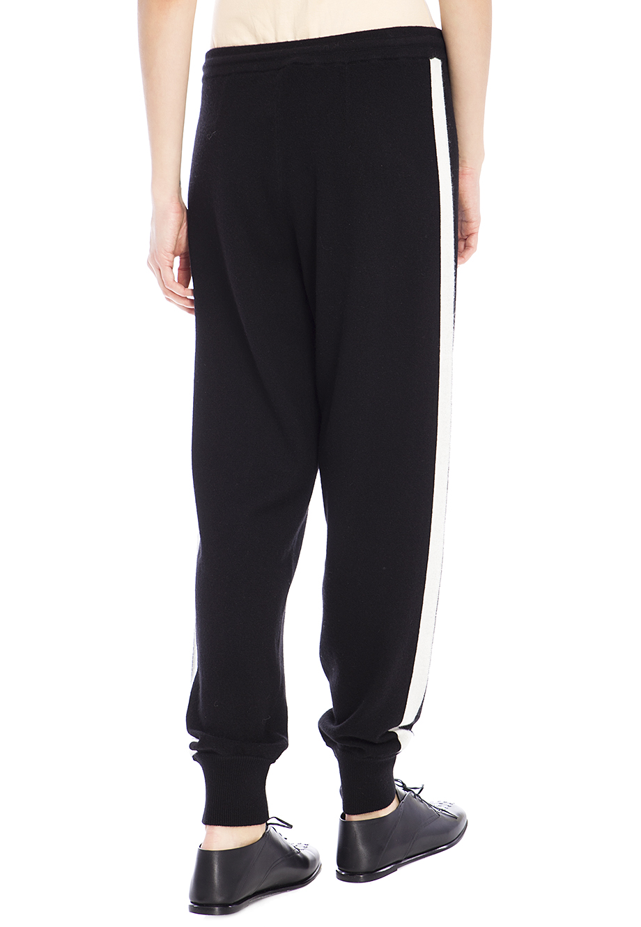 Детали: прямой крой, собранный книзу эластичной манжетой, высокая посадка, пояс на кулиске с резинкой, контрастные лампасы.
