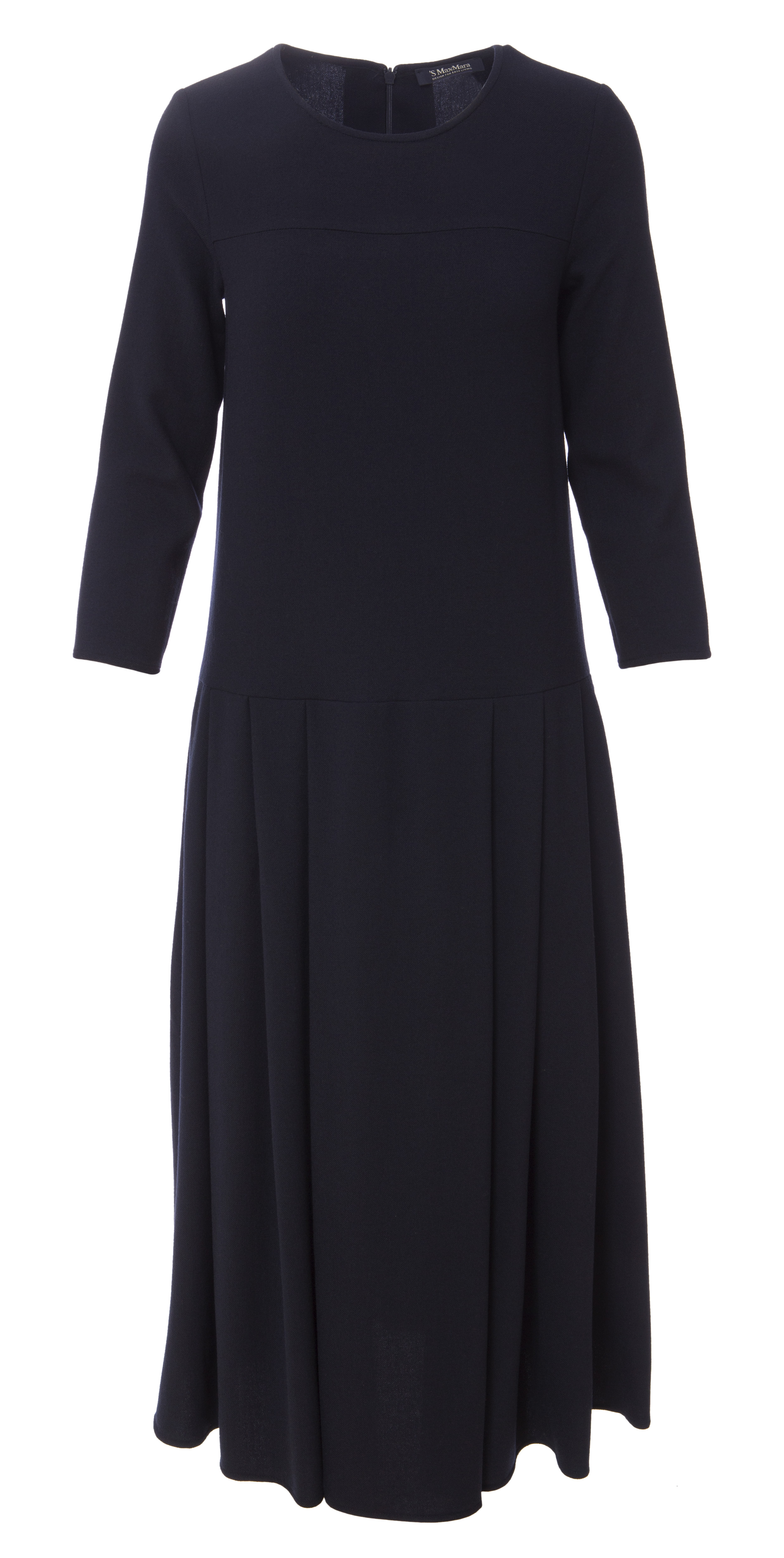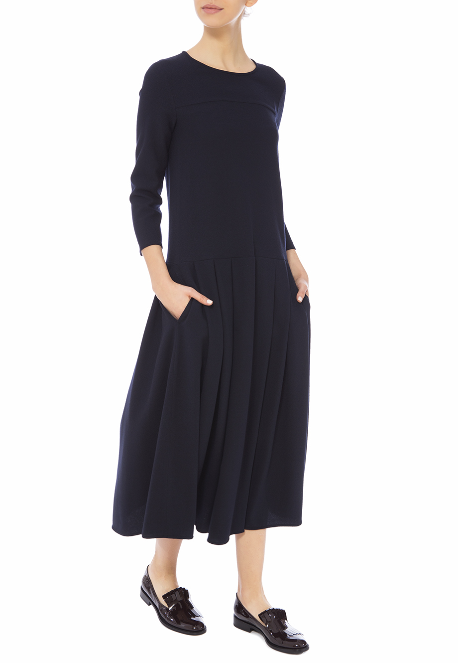 Детали: заниженная отрезная линия талии, юбка с крупными складками и французскими карманами. Круглый вырез горловины, длинный втачной рукав, кокетка. Застегивается потайной молнией на спинке.
