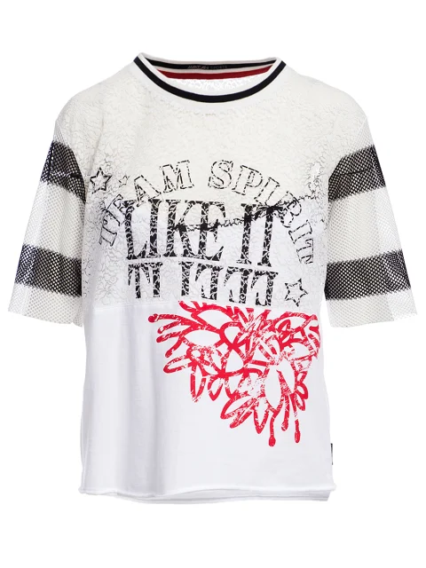 Детали: прямой свободный крой, круглый вырез горловины, короткий втачной рукав из сетки в полоску, на груди вставка из гипюра и имитация майки. Печатный принт на груди.