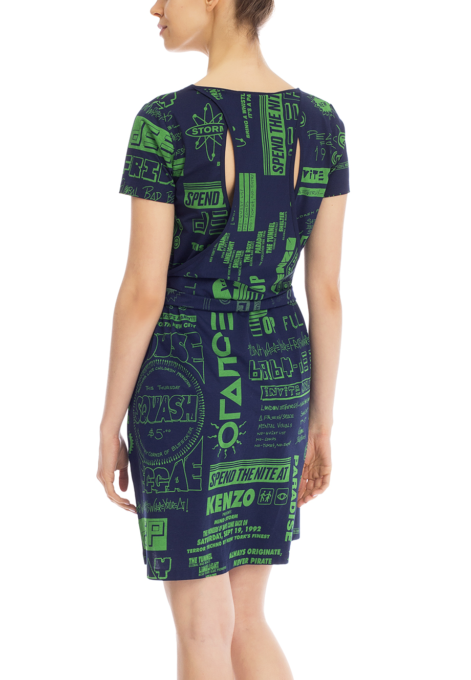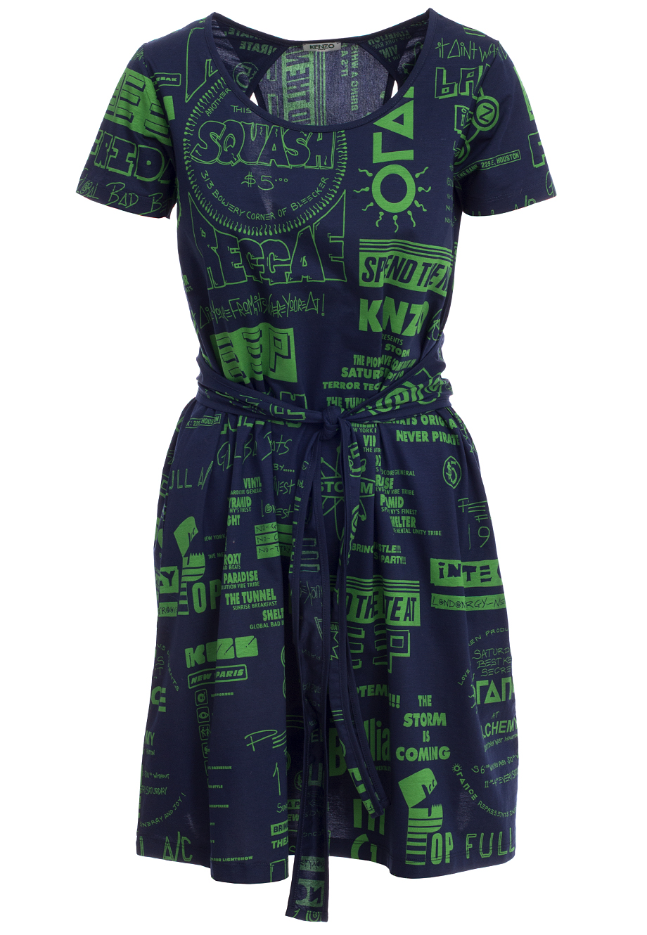 Детали: прямой крой, длина выше колена, круглый вырез горловины, короткий втачной рукав, овальный вырез на спинке, дополнительная полочка, переходящая в пояс-кушак на талии.