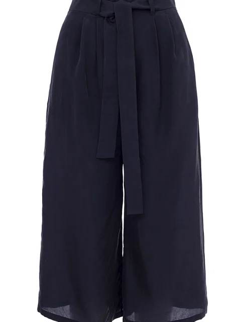Детали: свободный крой от бедра, высокая посадка, двойные защипы, пояс со шлевками для ремня и пуговицей, дополнительный пояс.