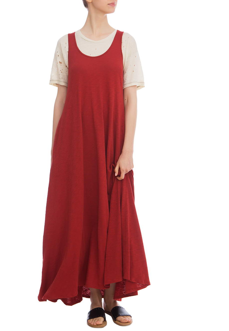 Детали: А-силуэт, круглая форма декольте, широкие бретели, полукруглый ассиметричный подол, прорезные карманы по боковым швам.