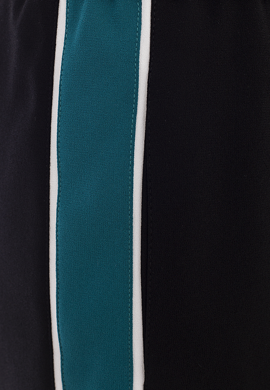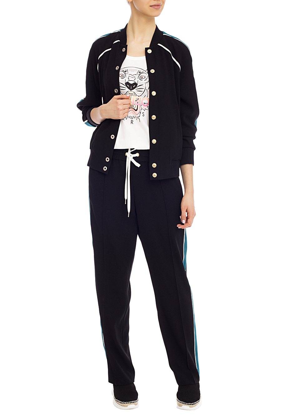 Детали: прямой крой, высокая посадка, эластичный пояс с кулиской, прорезные карманы по боковым швам, лампасы, простроченные стрелки вдоль штанин.