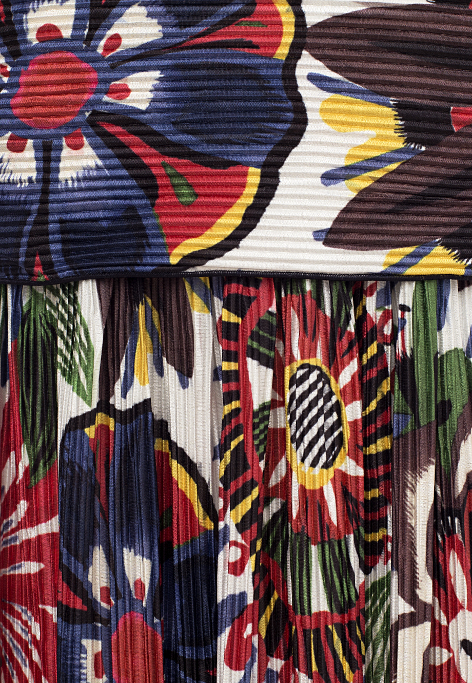Детали: свободный силуэт, отрезная линия талии, лиф с поперечной плиссировкой, вырез горловины лодочкой, без рукавов, юбка со сборками, завышенная линия талии, цветочный принт