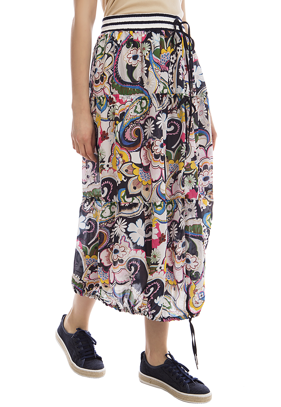 Детали: прямой крой, два яруса со сборками, пояс с кулиской, по подолу затяжка со шнурком. Экзотический цветной принт.