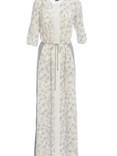 Детали: прямой силуэт, круглый вырез горловины, втачной рукав длиной ¾ с небольшими разрезами, декоративная планка по всей длине, боковые разрезы и прорезные карманы, кулиска с завязками по линии талии. Фирменный принт с символическими звёздами, задняя деталь юбки из однотонного серого крепа.