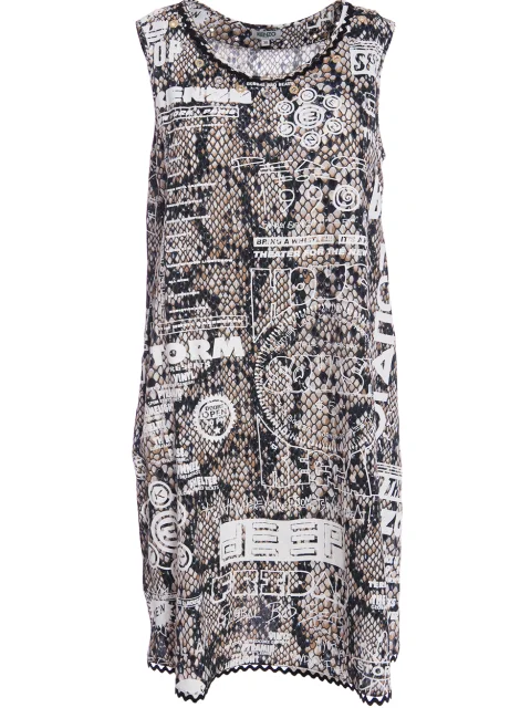 Детали: прямой крой, длина выше колена, круглый вырез декольте, без рукавов. Отделка по подолу волнистой тесьмой, по линии декольте – тесьма и люверсы. Принт имитирующий змеиную кожу, печатные тексты.