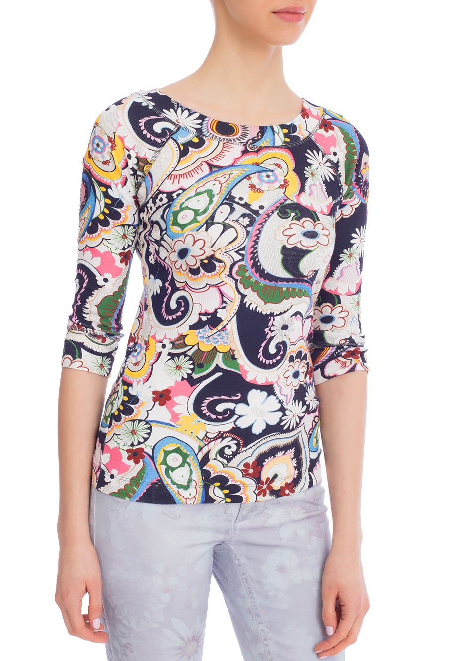 Детали: облегающий крой, вырез горловины лодочкой с широким мандатом, рукава реглан длиной ¾, фирменная фактура ткани в рубчик.