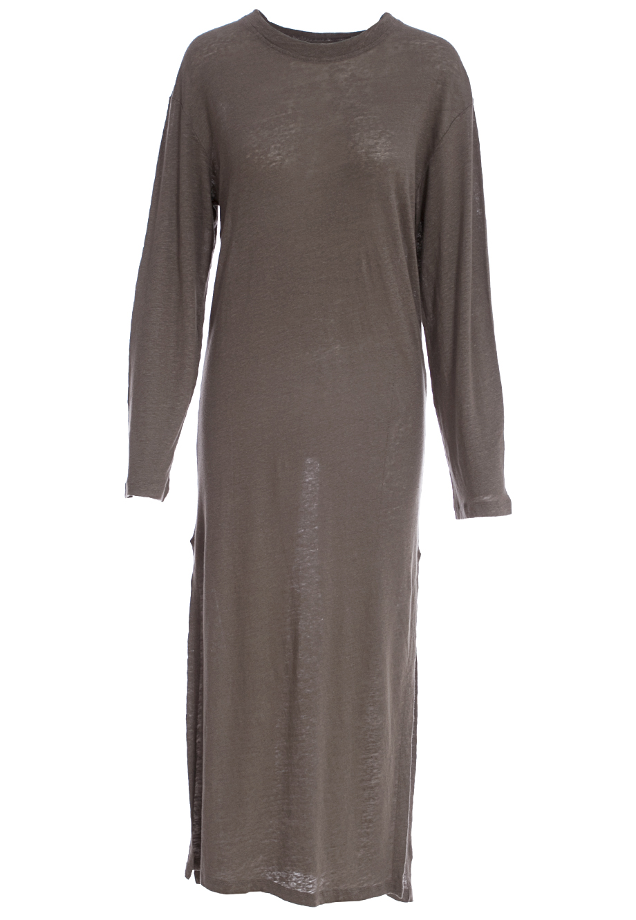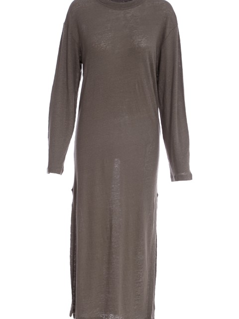 Детали: прямой свободный крой, круглый вырез горловины, длинный спущенный рукав, длина миди, боковые разрезы. Полупрозрачная фактура льняного джерси.