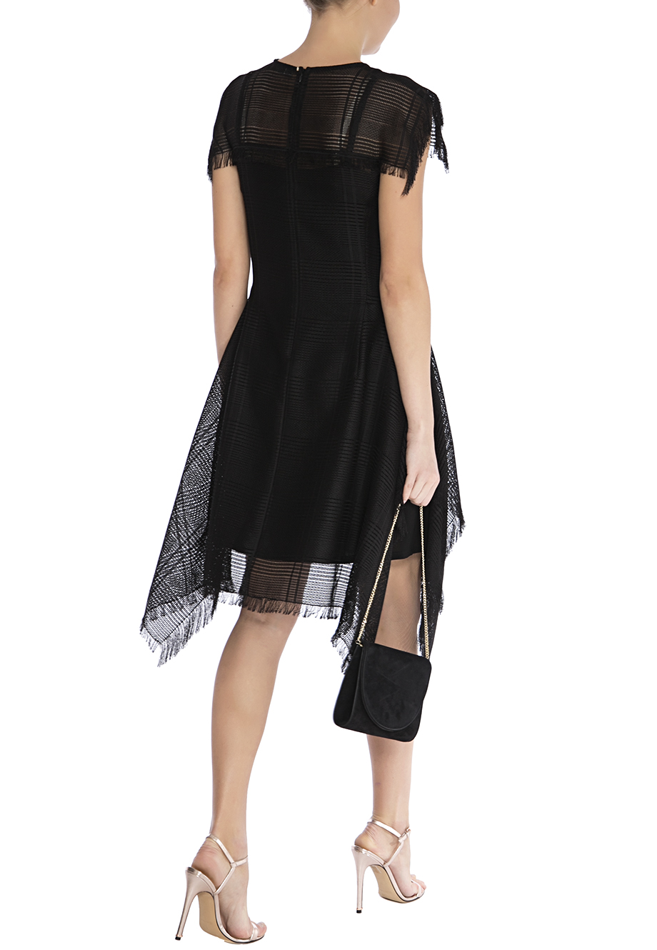 Детали: облегающий крой лифа с оригинальной короткой пелериной и бахромой по краю. Круглый вырез горловины, потайная молния на спинке. Юбка со сборками от линии талии с ассиметричный подолом и бахромой по краю. Длина выше колена. Сетчатая полупрозрачная фактура ткани, подклада черного цвета из ацетата.