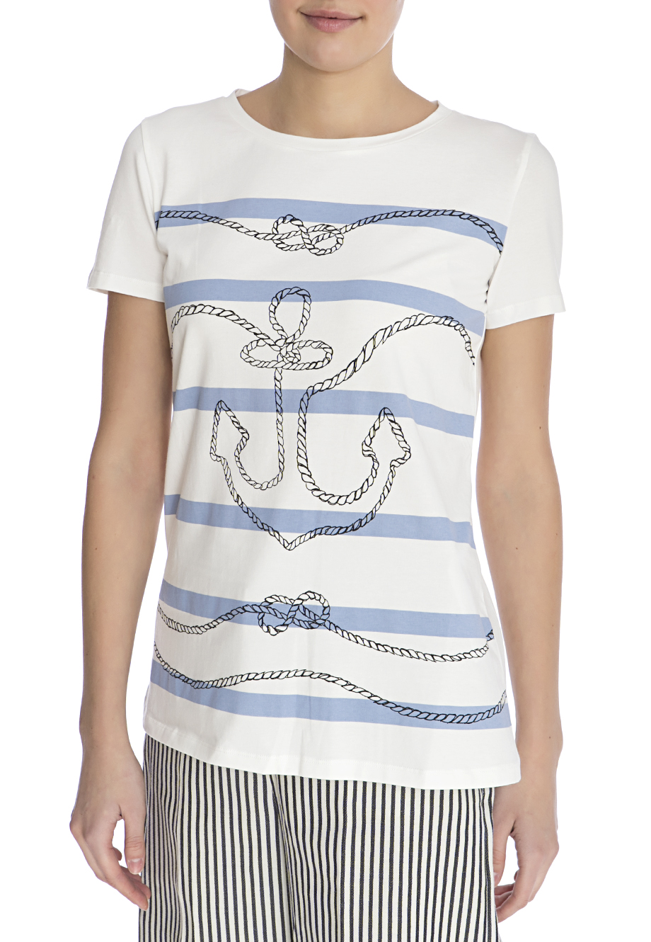Детали: прямой крой, круглый вырез горловины, короткий рукав. Принт в полоску и прорисованный якорь.