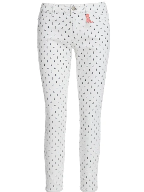 Детали: облегающий крой, средняя посадка, пять карманов, пояс со шлёвками для ремня, принт в якоря.