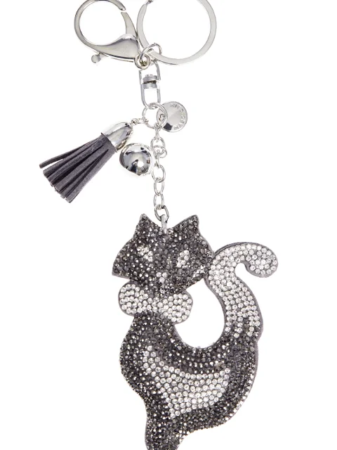 Детали: замшевый брелок в форме кошки. Инкрустация кристаллами, цепочка с подвесками, карабин.