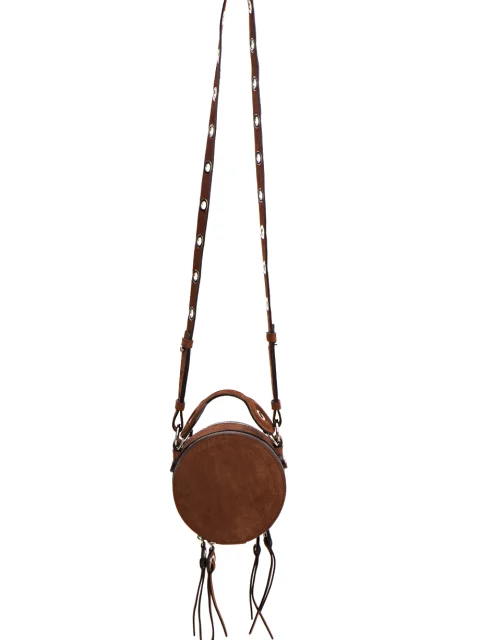 Детали: круглая форма, наполированный замш, две металлические молнии по диаметру с кожаными хлястиками на бегунках, фигурная ручка с люверсами, регулируемый плечевой ремень, декорирован люверсами. Два отделения.