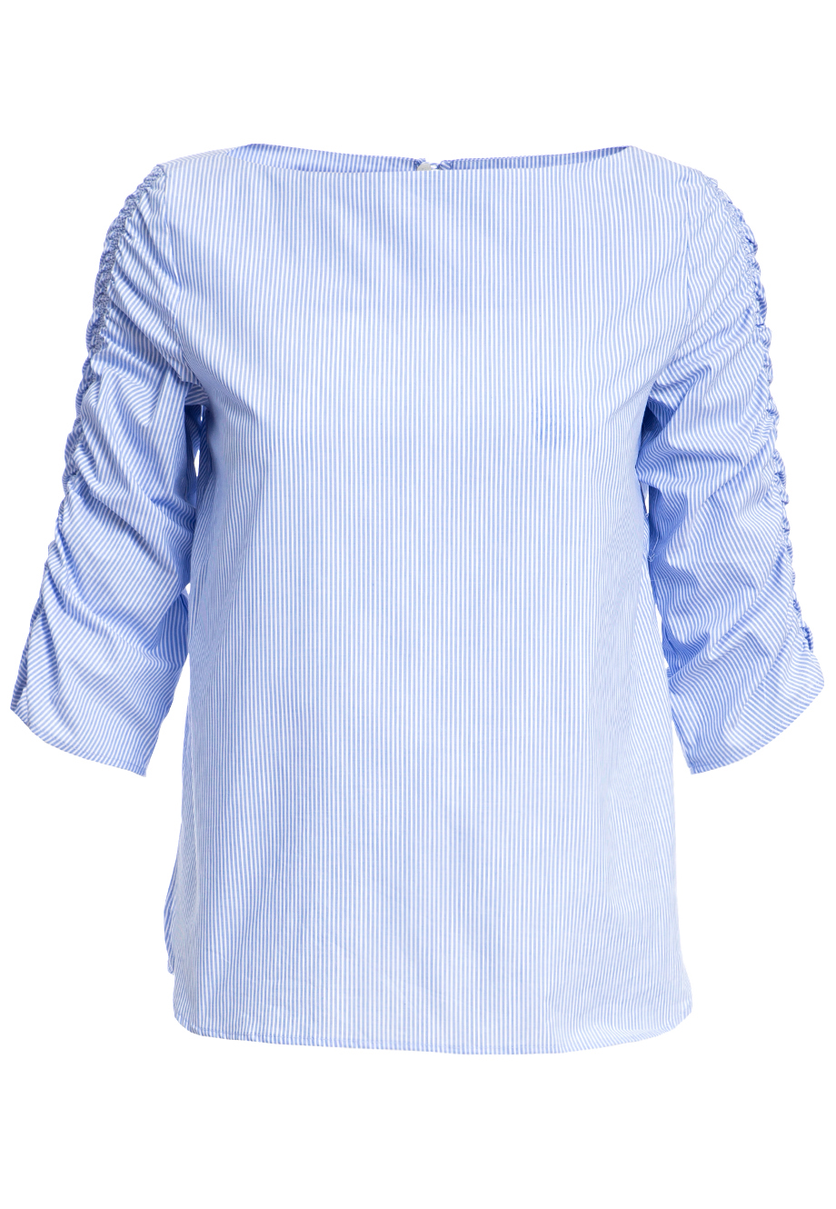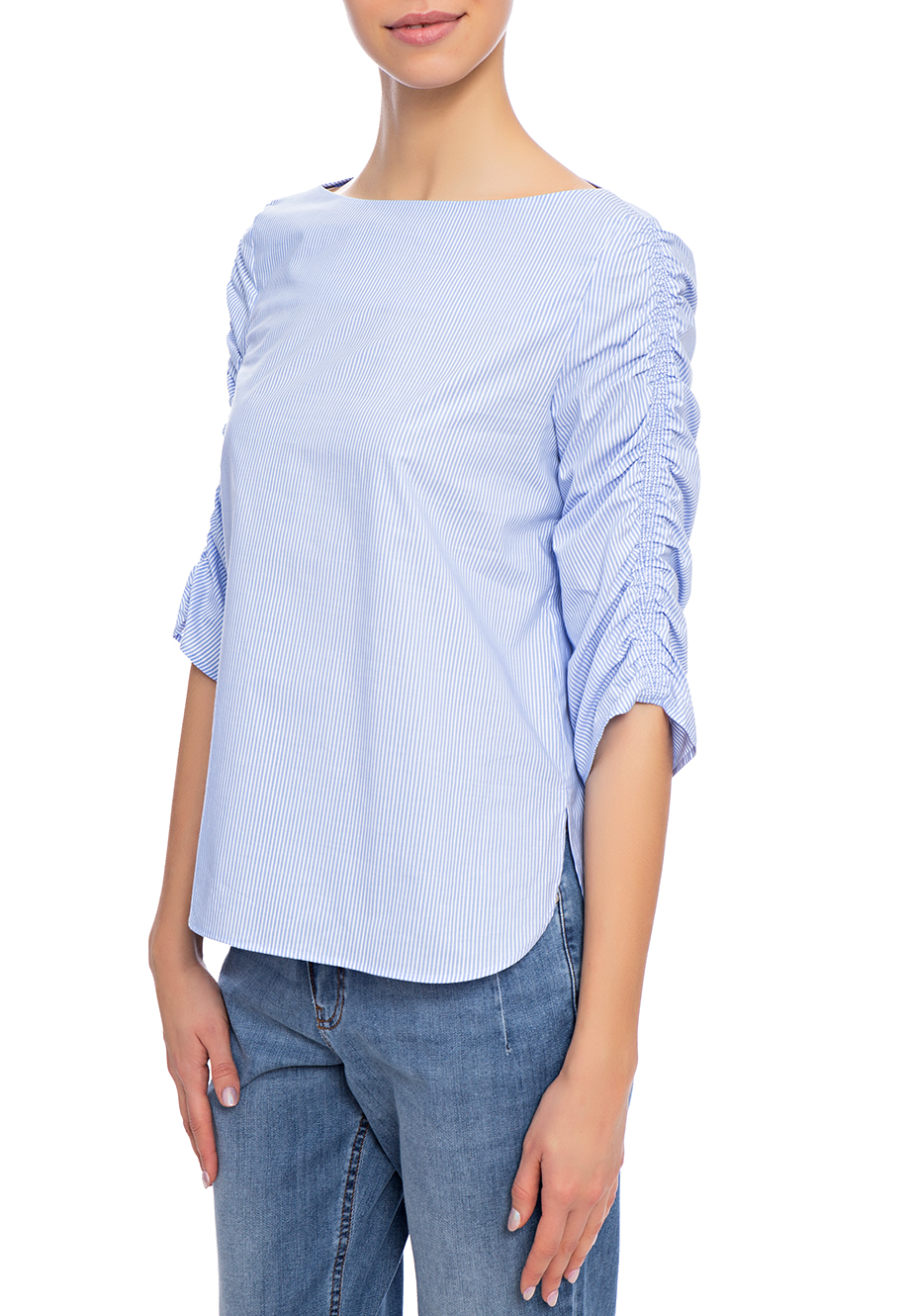 Детали: прямой крой, вырез горловины лодочкой, рукав реглан длиной ¾ с декоративной сборкой, закруглённый нижний край, боковые разрезы, на спинке пуговица с вырезом каплей.