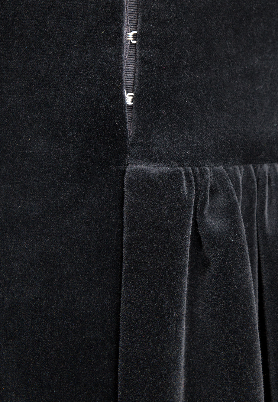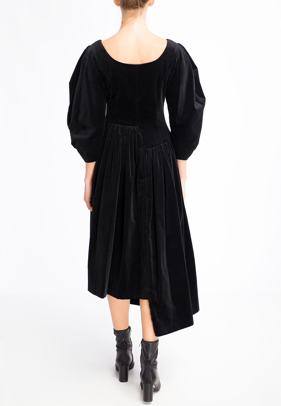 Детали: А-силуэт, V-образная форма декольте, круглый вырез на спинке, планка с крючками, объёмный втачной рукав длиной ⅞, отрезная линия талия, асимметричная юбка со сборкой.