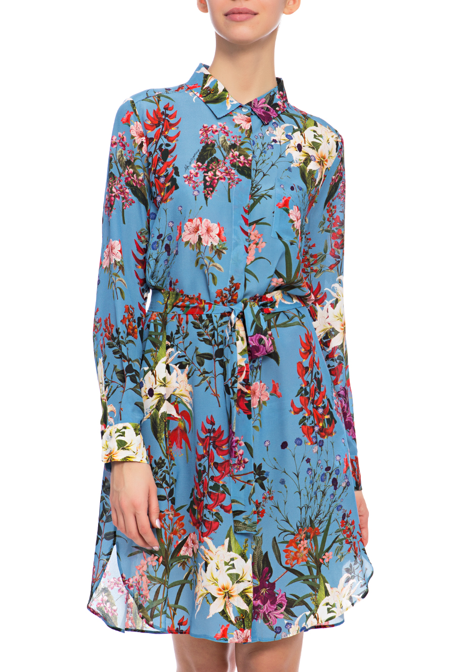 Детали: прямой крой, отложной воротник, длинный втачной рукав, собранный манжетой на пуговице, закруглённый нижний край, боковые разрезы, удлинённая спинка. Застегивается рядом пуговиц, пояс по линии талии.