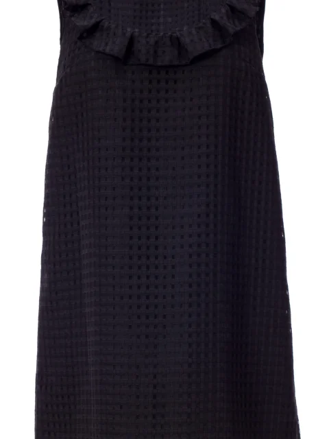 Детали: платье без рукавов из жаккарда с квадратным мотивом, А-образный силуэт, свободная посадка, округлый вырез горловины повторяет ряд рюшей на груди; на спине потайная молния и вырез капля на застежке; изделие на подкладе.