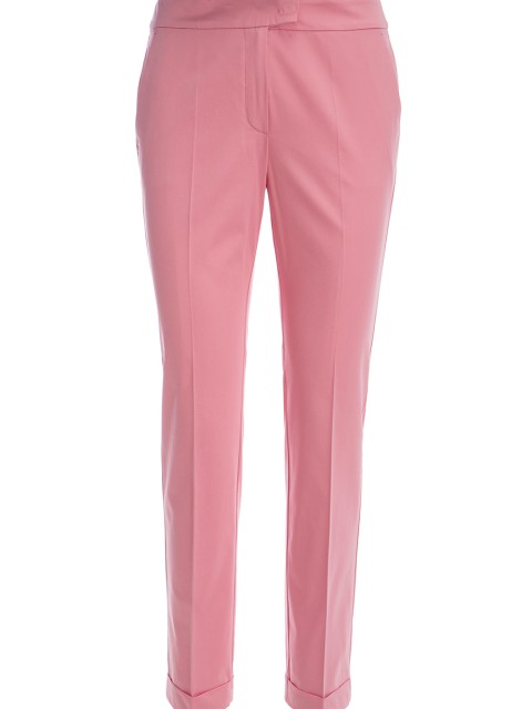 Детали: прямой крой, слегка зауженный книзу, высокая посадка, французские боковые карманы, сзади два прорезных с рантом, стрелки вдоль штанин, отвороты по нижнему краю.