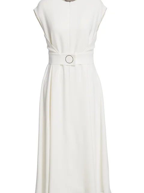 Детали: А-силуэт, круглый вырез горловины, с потайной молнией на груди, цельнокроеный короткий рукав, пришитый по бокам пояс с кнопкой, юбка-полусолнце, прорезные карманы по боковым швам.