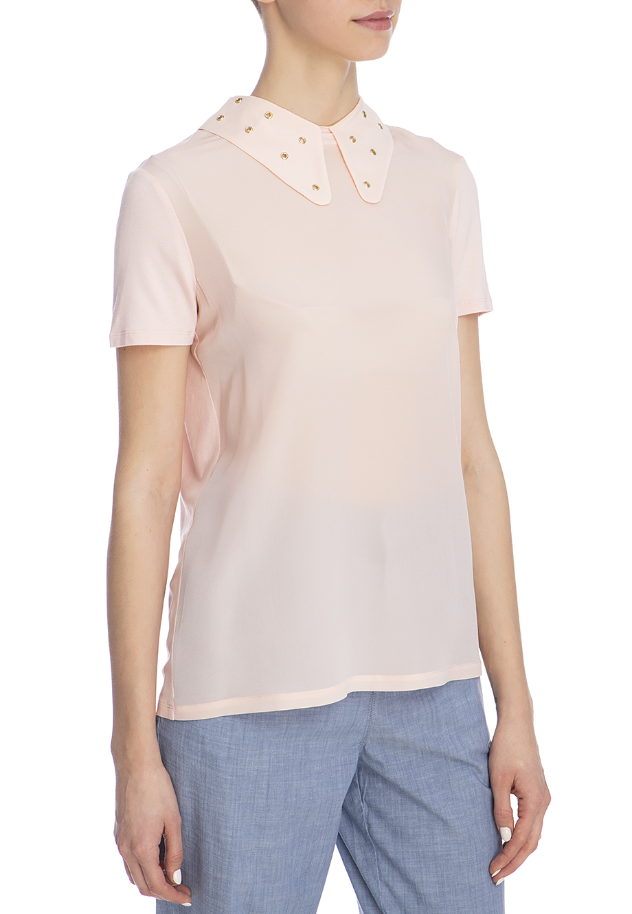 Детали: прямой крой, отложной воротник с декором из люверсов, короткий втачной рукав, на спинке вырез каплей с потайной пуговицей.
