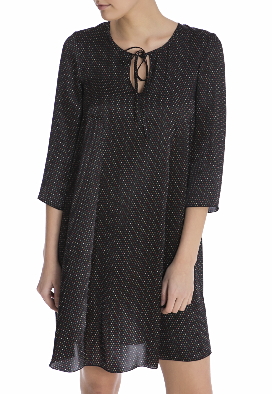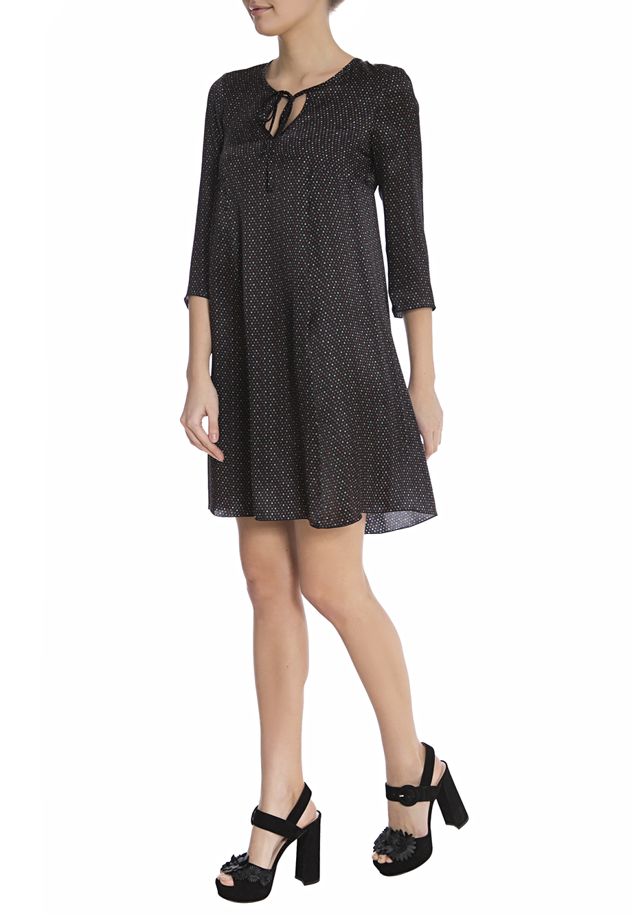 Детали: свободный крой от груди, круглый вырез горловины с завязками и каплей, втачной рукав длиной ¾, ассиметричный подол, удлинённый по спинке.