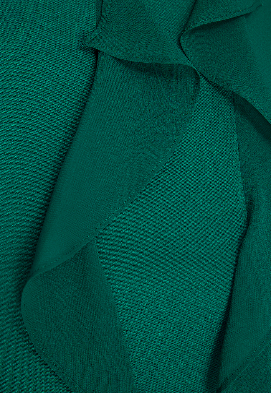 Детали: прямой крой, круглый вырез горловины с каплей и пуговицей на спинке, тройной волан на груди.