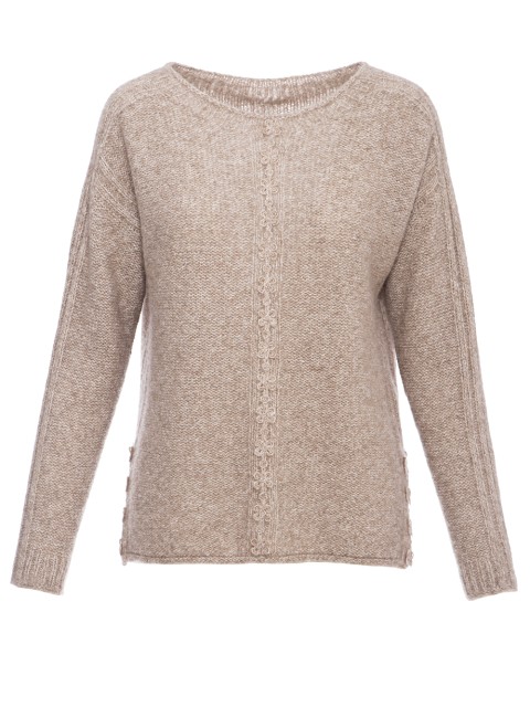 Детали: прямой крой, круглый вырез горловины, длинный цельнокроеный рукав, боковые разрезы, декор вязаными миниатюрными цветами.