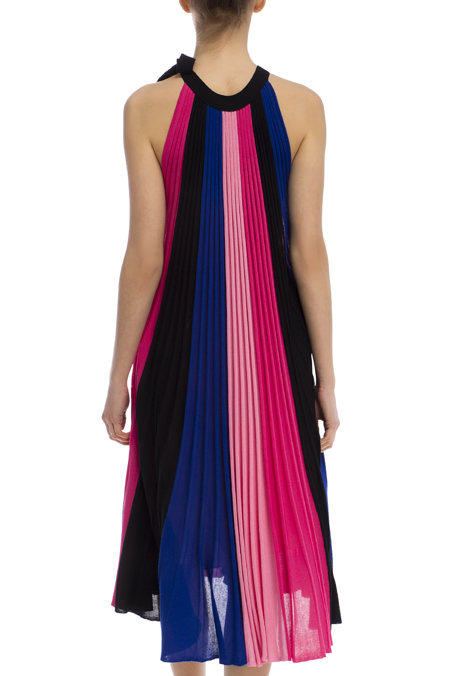 Детали: А-силуэт, американская пройма с лентой, широкие полосы контрастных цветом, плиссировка.