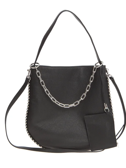 Детали: закруглённая плоская форма, матовая зернистая кожа, кожаная ручка с цепью и отстёгивающийся плечевой ремень. Отстёгивающийся маленький кошелёк, скрытая магнитная кнопка.