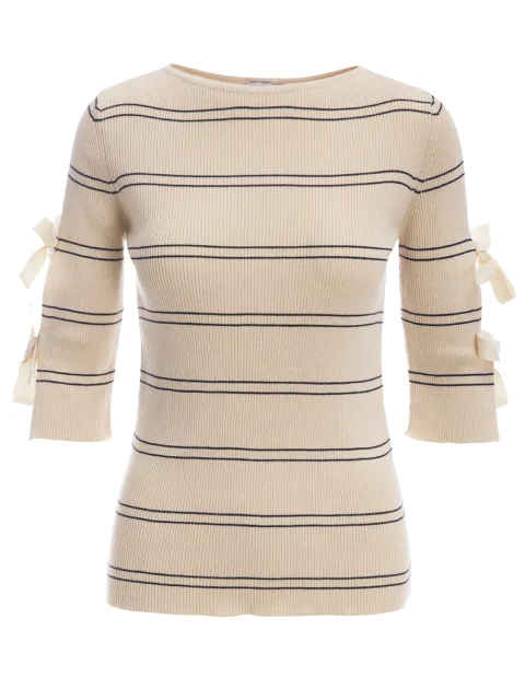 Детали: прямой крой, вырез горловины лодочкой, втачной рукав длиной до локтя с разрезами и бантами. Рисунок в тонкие полосы.