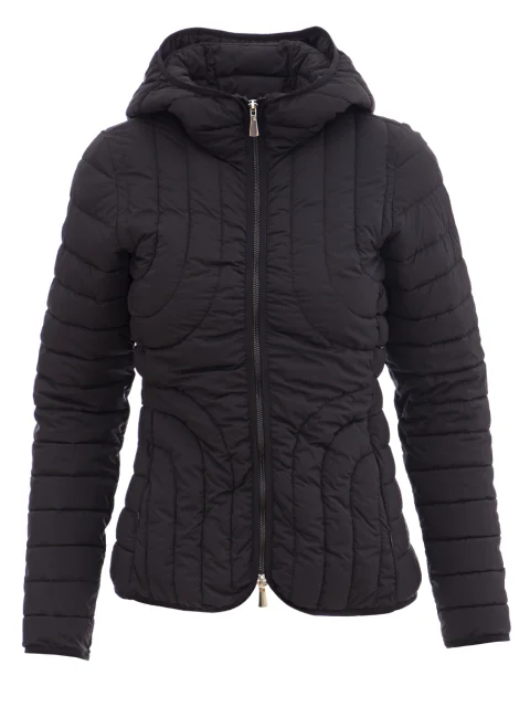 Детали: приталенный силуэт, высокий ворот с капюшоном, прорезные карманы с потайными молниями по бокам. Застёгивается молнией с двумя бегунками.