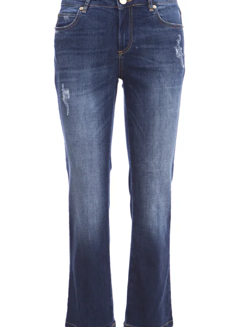Детали: прямой укороченный крой, средняя посадка, пять традиционных карманов, потертости и прорехи, контрастная строчка. Пояс со шлевками для ремня, пуговица, ширинка.