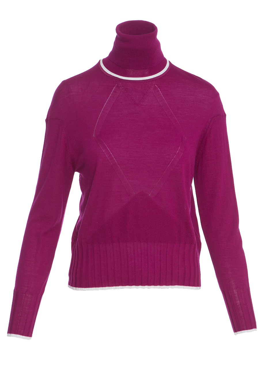 Детали: прямой крой, высокий ворот с отворотом, длинный втачной рукав с высокой вязаной манжетой, резинка по нижнему краю, контрастный кант, вязаный узор.