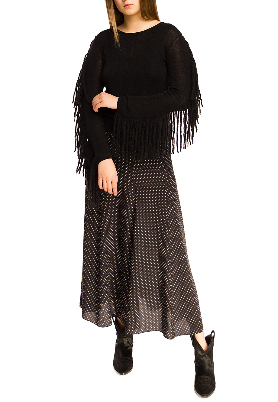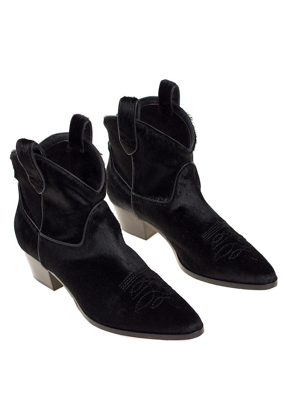 Детали: заострённый носок, традиционная вышивка на носке, прямая подошва и скошенный каблук контрастного цвета, широкое голенище гармошкой, мех пони.