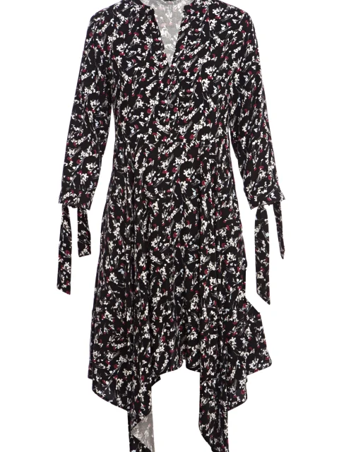 Детали: А-силуэт, круглый ворот с планкой и пуговицами, втачной рукав длиной 7/8, собранный манжетой с завязками, асимметричный подол, мягкие складки юбки, цветочный паттерн.