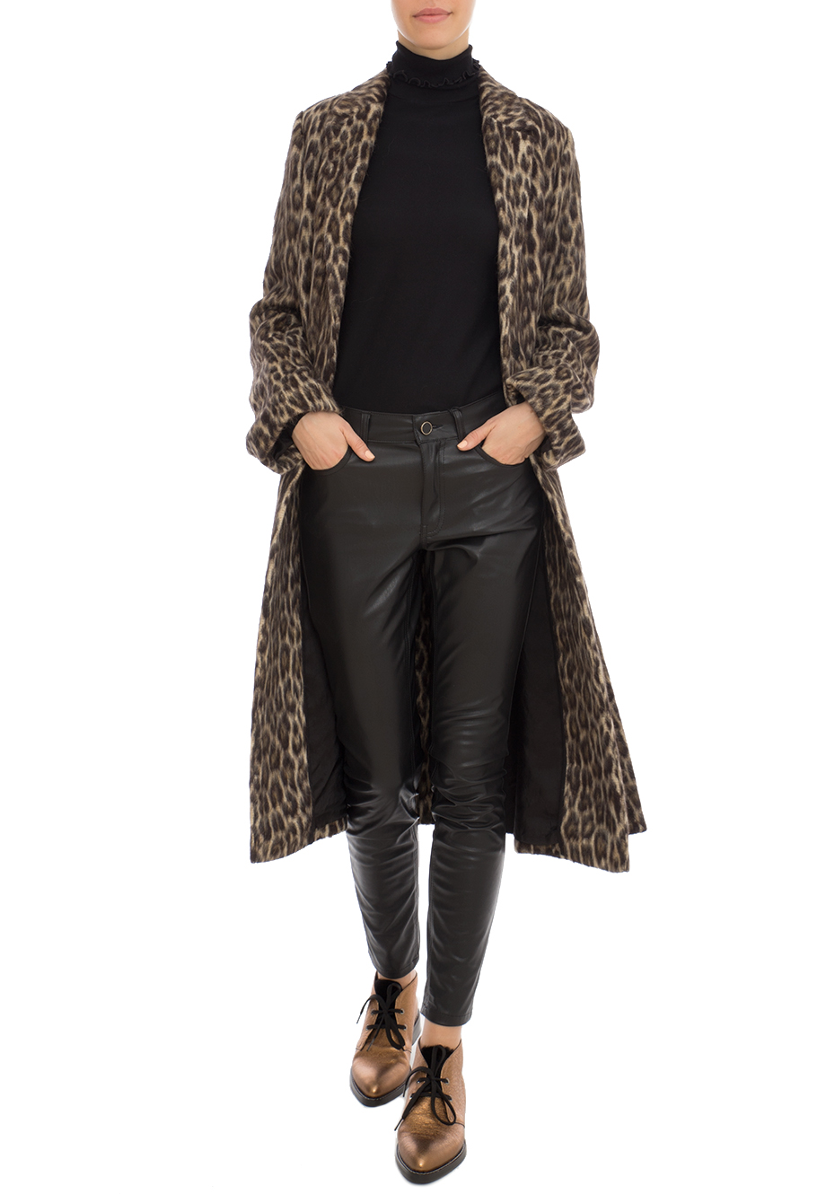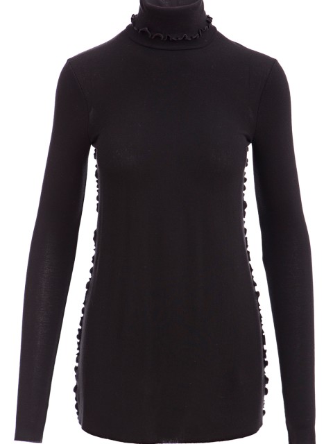 Детали: облегающий крой, высокий ворот с отворотом, длинный рукав, рюша по боковым швам и вороту.