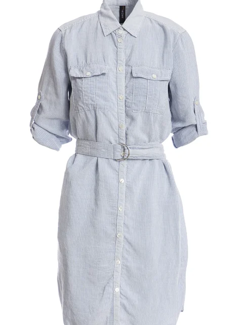 Детали: прямой крой под пояс, отложной воротник, два нагрудных кармана, втачной рукав с отворотами длиной до локтя, закругленный нижний край, планка с рядом пуговиц, пояс с затяжной пряжкой.