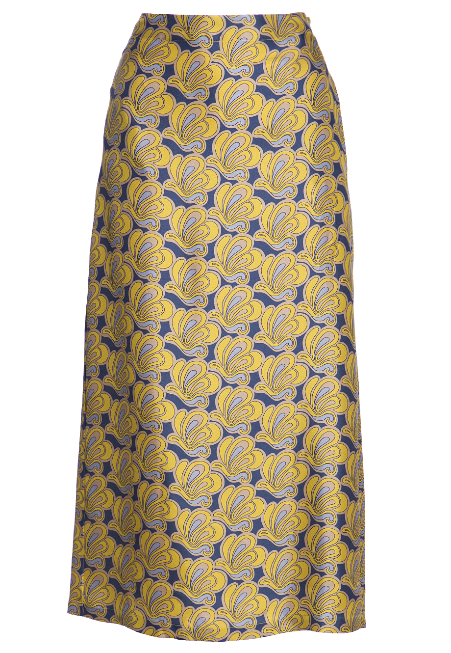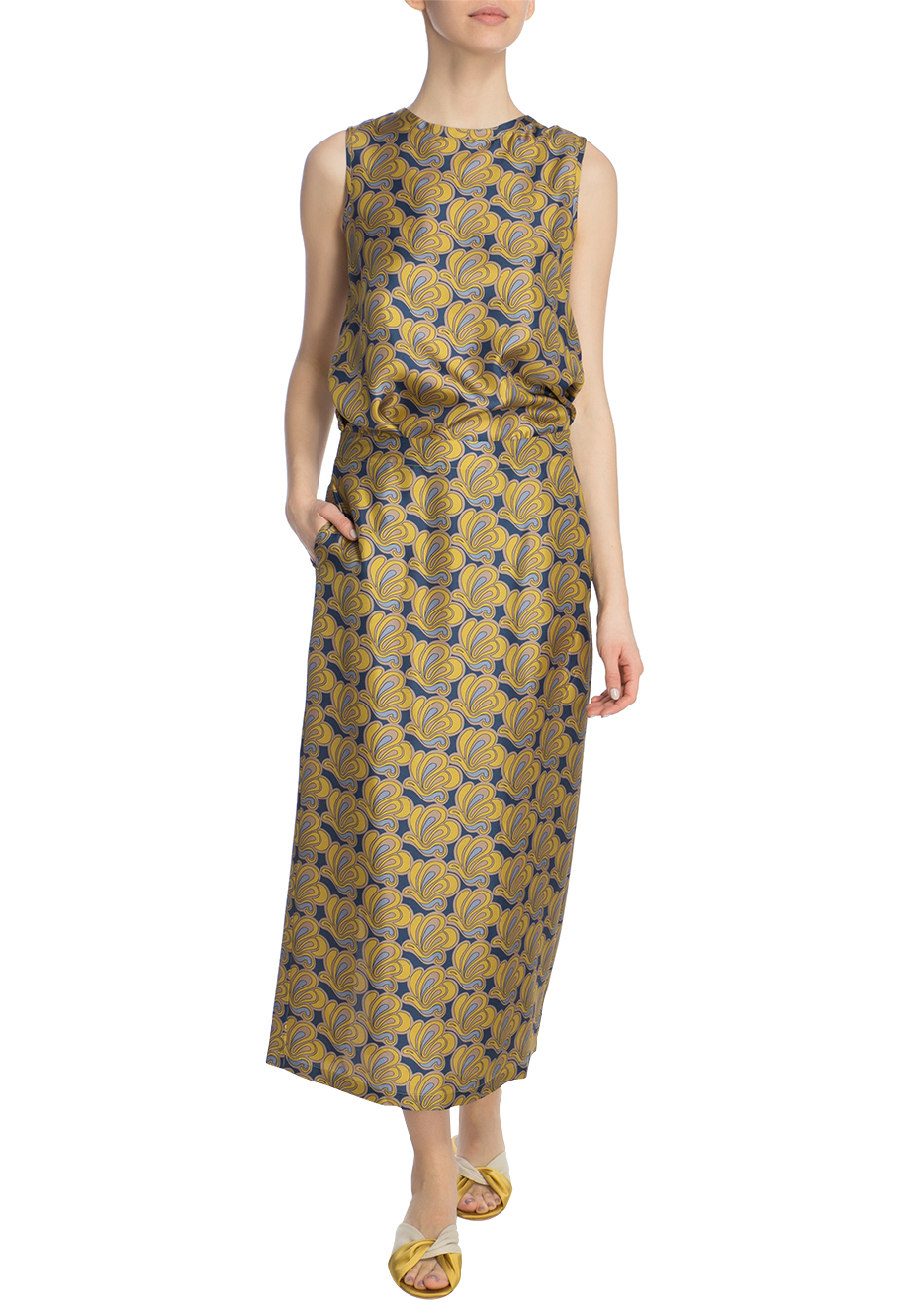 Детали: прямой крой, высокая посадка, пояс с эластичной вставкой на спинке, прорезные карманы по боковым швам, орнамент.