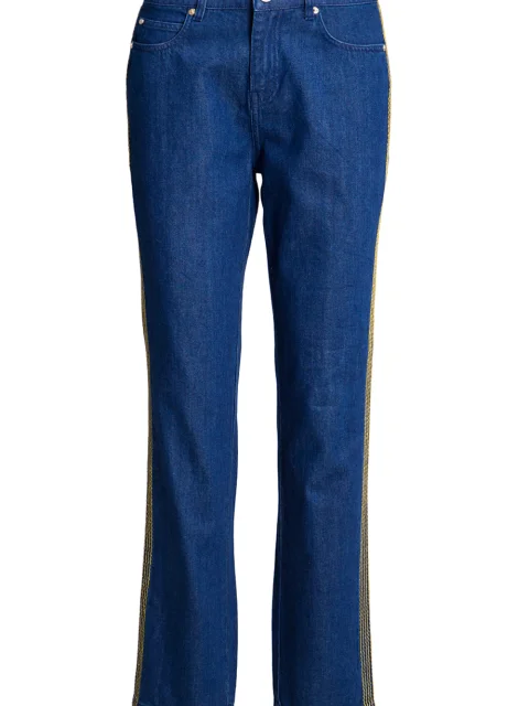 Детали: прямой крой, средняя посадка, пять карманов, лампасы по боковым швам, пояс со шлёвками для ремня, пуговица, ширинка.