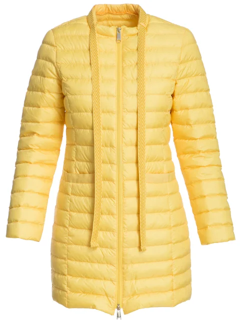 Детали: прямой крой, круглый вырез горловины с декоративными лентами, длинный втачной рукав, прорезные карманы с рантом по бокам. Утеплитель – пух/перо (90/10%).