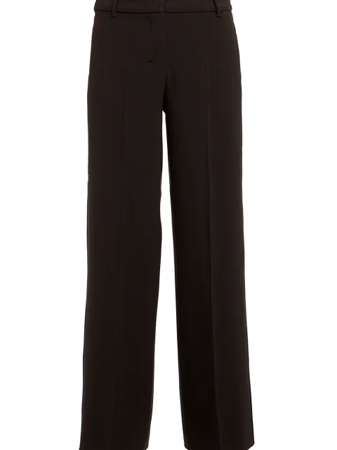 Детали: прямой свободный от бедра крой, средняя посадка, прорезные карманы по бокам, сзади два прорезных с рантом и пуговицей, стрелки вдоль штанин.
