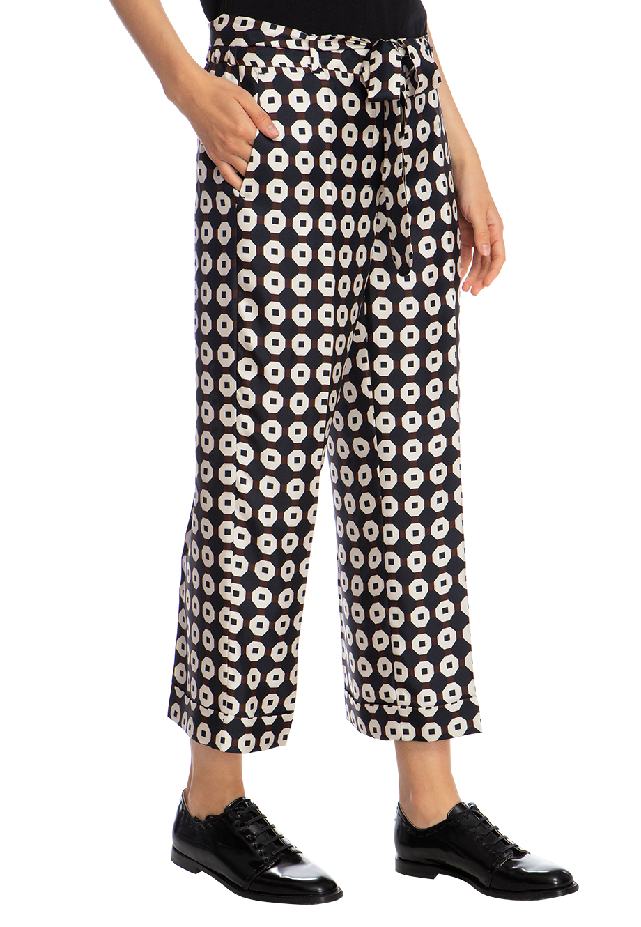 Детали: прямой укороченный крой, средняя посадка, пояс-лента, геометрический принт, французские боковые карманы, стрелки вдоль штанин, отвороты по нижнему краю.