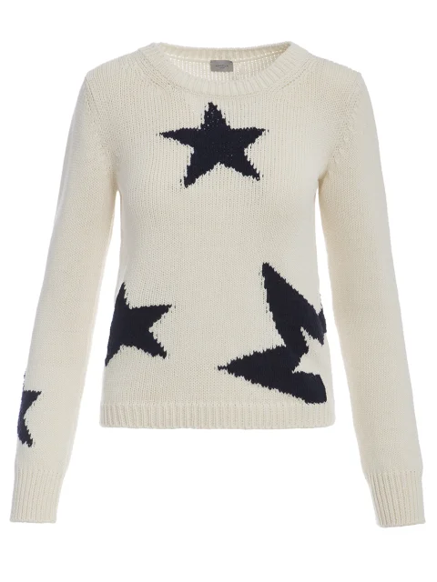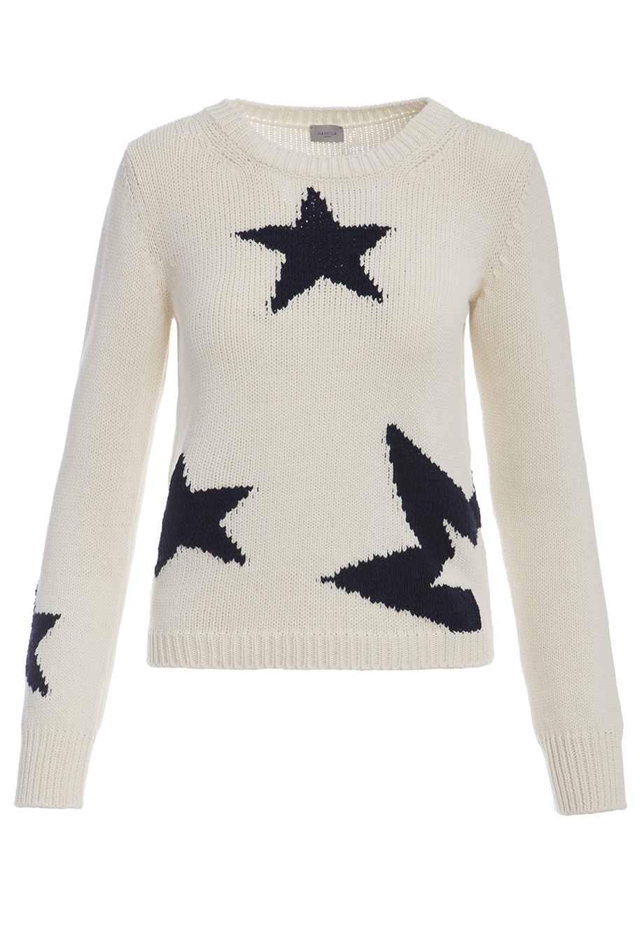 Детали: прямой крой, круглый вырез горловины, длинный втачной рукав, гладкая вязка, резинка по нижнему краю и на рукавах, контрастные звёзды.