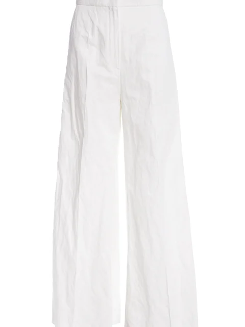 Детали: крой-клёш от бедра, высокая посадка, французские боковые карманы, сзади два прорезных с рантом, стрелки вдоль штанин, жатая текстура, потайной крючок, ширинка.
