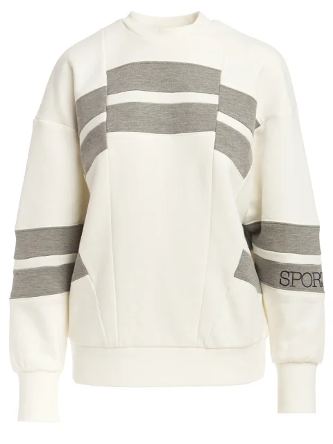 Детали: овальный крой, круглый вырез горловины, спущенный длинный рукав, высокая манжета, контрастные асимметричные вставки и логотип.